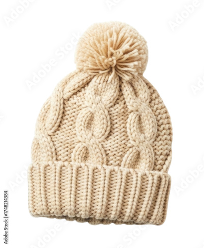 Cozy beige knit beanie with pom pom design for winter wear transparent background, cutout PNG