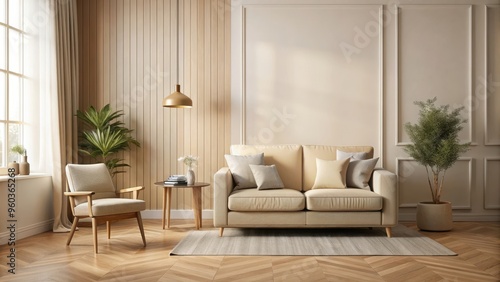 Cozy beige room interior with chair and sofa, room, chair, sofa, interior, beige, cozy, modern, comfortable, living space