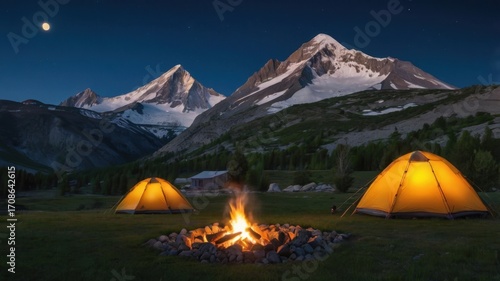 Cozy camping under starry night sky with warm campfire and illuminated tents near majestic mountains