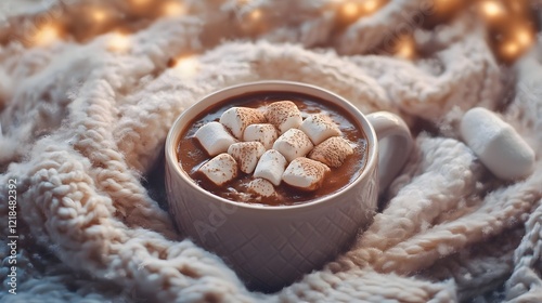 Cozy Chocolate Drink with Melted Marshmallows and Knit Blanket Background