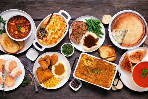 Cozy comfort food table scene. Overhead view over a dark wood background. Meatloaf, stew, pot pie, mac and cheese, grilled cheese, soup, fried chicken, shepherds pie and warm sides.