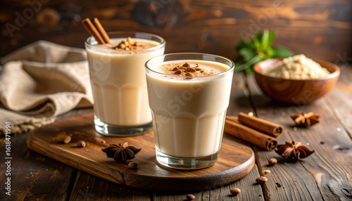 Cozy comfort in a glass, two glasses of milk with cinnamon and nut topping two