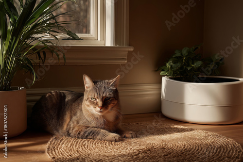 Cozy corner with a cat enjoying a warm sunlight spot in the home