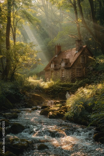 Cozy cottage surrounded by trees and a gentle stream