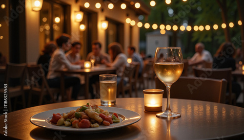 Cozy evening dining scene at an outdoor café with wine and a delicious plate of food, soft ambient lighting creates intimacy