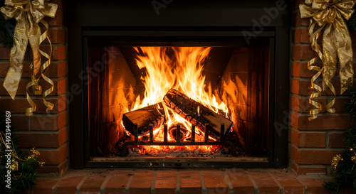 Cozy Fireplace Scene With Burning Wood And Festive Holiday Decorations
