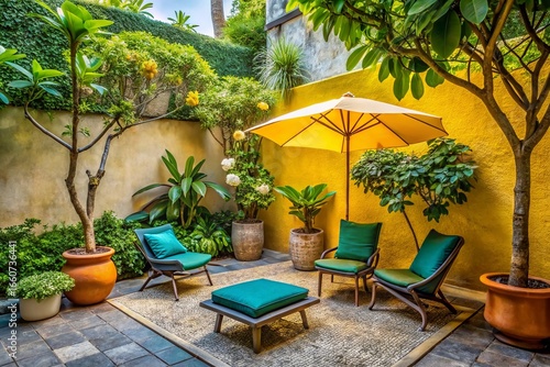 Cozy Garden Reading Nook: Vintage Architectural Digest Style Patio with Frangipani Tree & Acapulco Chairs