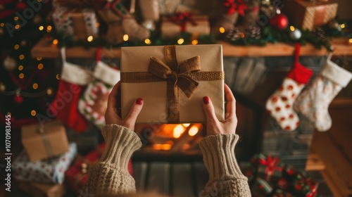 Cozy Holiday Atmosphere: Gift Giving by Decorated Fireplace with Stockings