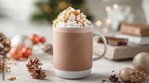Cozy Hot Chocolate with Whipped Cream and Caramel Drizzle Surrounded by Holiday Decorations and Sparkling Ornaments for Seasonal Vibes