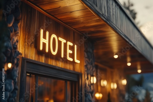Cozy Hotel Entrance with Warm Wood and Stone Accents