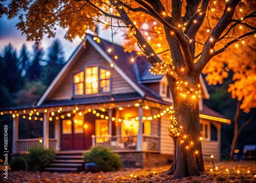 Cozy House Porch Lights, Warm Evening, Tree, Bokeh, Autumn