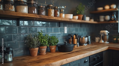Cozy kitchen with herbs and jars, rustic style