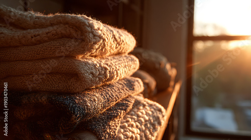Cozy Knitted Blankets Stacked by Window Bathed in Warm Golden Hour Sunset Light, Evoking Comfort and Serenity