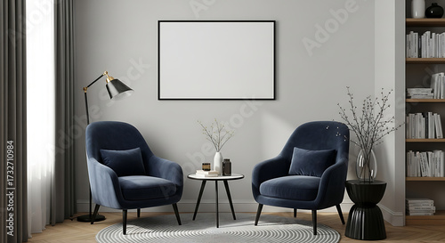 Cozy living room featuring a blank picture frame above two plush armchairs, complemented by a small table, bookshelf, and soft lighting, creating a comfortable and inviting atmosphere for relaxation a