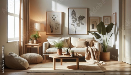 Cozy living room, neutral color palette, beige sofa, wooden coffee table, framed botanical prints, potted plants, natural light, textured throw pillows, woven basket, minimalist decor, earth tones, so