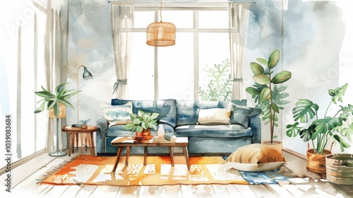 Cozy Living Room with Blue Sofa and Natural Light