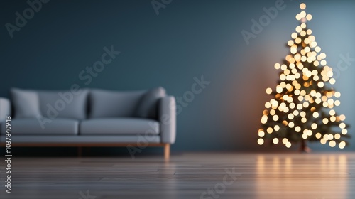 Cozy Living Room with Christmas Tree and Soft Lighting