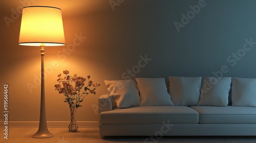 Cozy Living Room with Floor Lamp and Flower Arrangement at Dusk