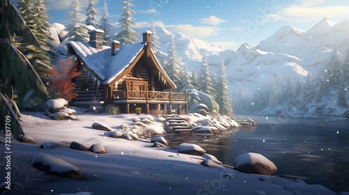 Cozy log cabin surrounded by a snowy wonderland. Idyllic, winter's charm, tranquil retreat, snow-covered landscape, holiday coziness, natural beauty. Generated by AI.
