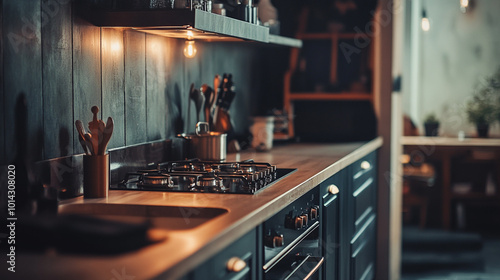 Cozy modern kitchen with warm lighting and wooden countertops in the early evening