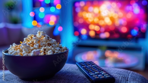 Cozy movie night setup with a bowl of popcorn and remote control, vibrant colors in the background for a relaxing home entertainment experience.