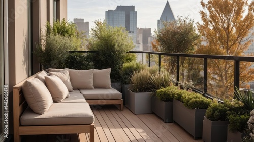 Cozy outdoor balcony with comfortable seating and city views is displayed