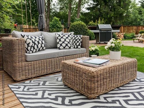 Cozy outdoor seating area with wicker furniture, vibrant greenery, and grill setup