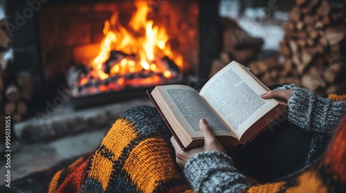 Cozy reading by the fireplace, warm blanket and flickering flames.