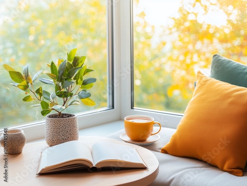 Cozy Reading Nook with Plant and Warm Beverage