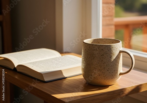 Cozy Reading Scene Coffee Mug and Open Book on Wooden Table by Window, Sunlight.