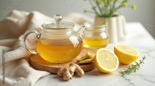 Cozy setup with a glass teapot filled with ginger tea and lemon slices
