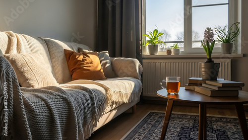 Cozy Sofa with Pillows and Throw Blanket.