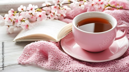 Cozy Spring Tea Break Book and Pink Flowers