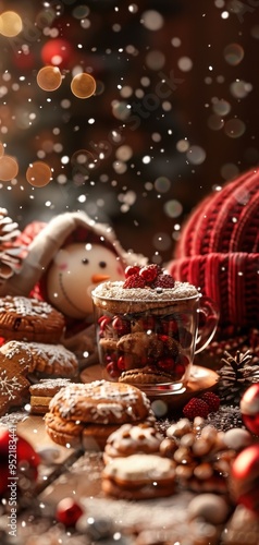 Cozy winter scene with cookies, a warm hat, and festive decorations, perfect for holiday celebrations. Snowflakes add a magical touch.