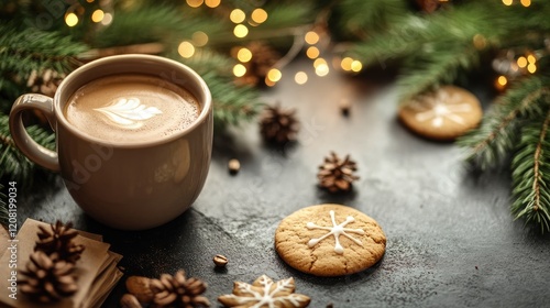 Cozy winter scene with festive New Year decorations coffee cookies and pine cones on textured table backdrop