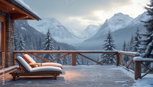 Cozy wooden deck overlooks snowy mountain range, forest. Two lounge chairs await on deck, inviting relaxation. Serene winter landscape offers peaceful escape, tranquil outdoor ambiance. Architectural