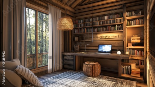Cozy wooden office space with a desk, bookshelves, and natural light.