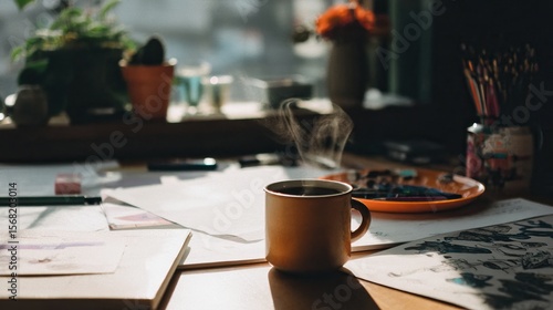 Cozy workspace with steaming coffee mug and art supplies
