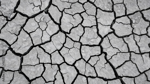 Cracked dry earth texture showcasing drought impact in monochrome