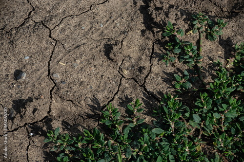 Cracked Earth and green grass. Dried Ground Texture