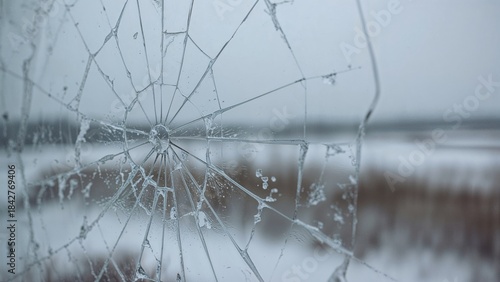 Cracked glass window with snow outside, cold and wintery scene.