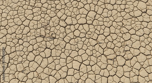 Cracked parched earth texture brown in color revealing a mosaic pattern Some tiny dry grass blades scattered across the surface