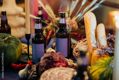 Craft Beer Bottles with Bread and Vegetables