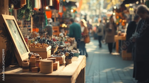 Craft Fair: Artisans selling handmade goods at a lively craft fair