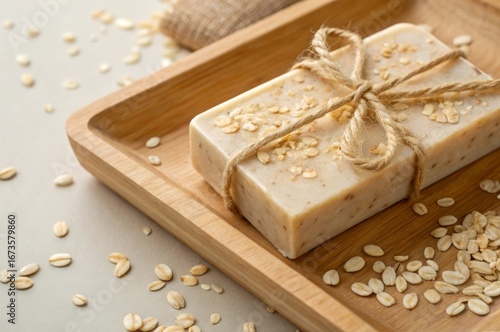 Crafting a handmade oatmeal soap bar with visible oat flakes in a rustic workshop setting