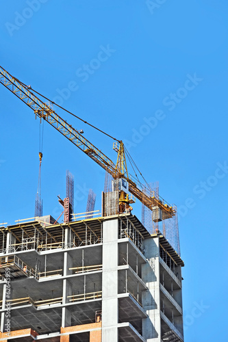 Crane and building construction site against blue sky