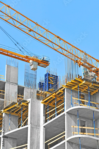Crane and building construction site against blue sky