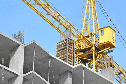 Crane and building construction site against blue sky