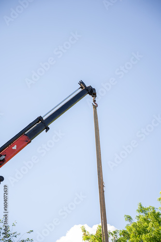 Crane on a truck for unloading wooden boards