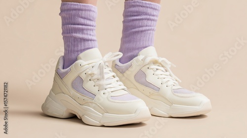 Cream sneakers with lilac socks on pale background